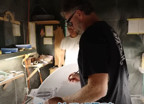 お客様のカスタムオーダーボードをシェイプしサインているシーンは必見ですよ!