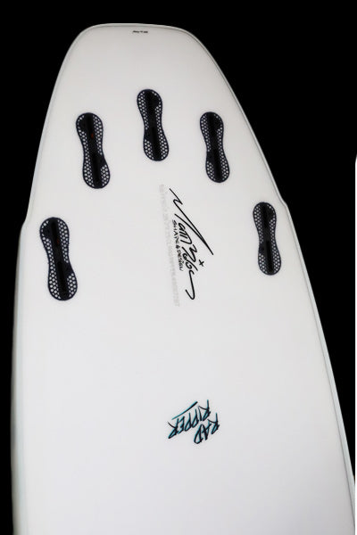 DOUBLE DARTサーフボードは本体の色が黒い為に、バキュームグラス手法ならではのカーボン繊維のラインが傷のように見えたり、通常のサーフボードと同じように製造過程でできる傷や、フィンガープリントがより見えている場合がございます。それらはDOUBLE DARTサーフボードのパフォーマンス性能やご使用には問題ありませんのでご安心してお求めください。