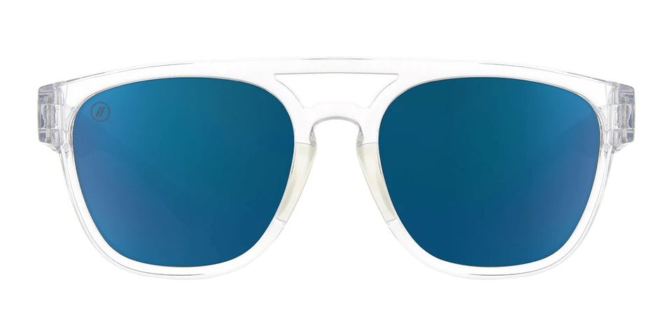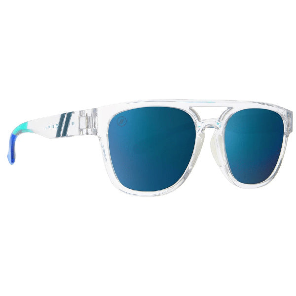 The polarized navy blue mirrored lenses and blue forward motion stripes are perfect for summer beach days.