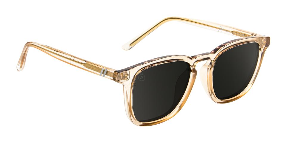The sophisticated "Crystal Almond Oil" clear frame is smartly finished in a gloss finish with dark brown TORTOISE along the upper brow, a gold metal plated core, and front and center are lenses that sparkle like a Santa Barbara sunset.