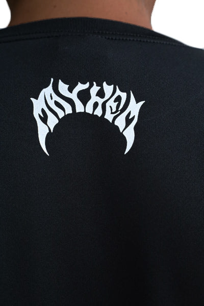 There is a "PLANET" logo on the chest and a "MAYHEM" logo on the back of the neck!