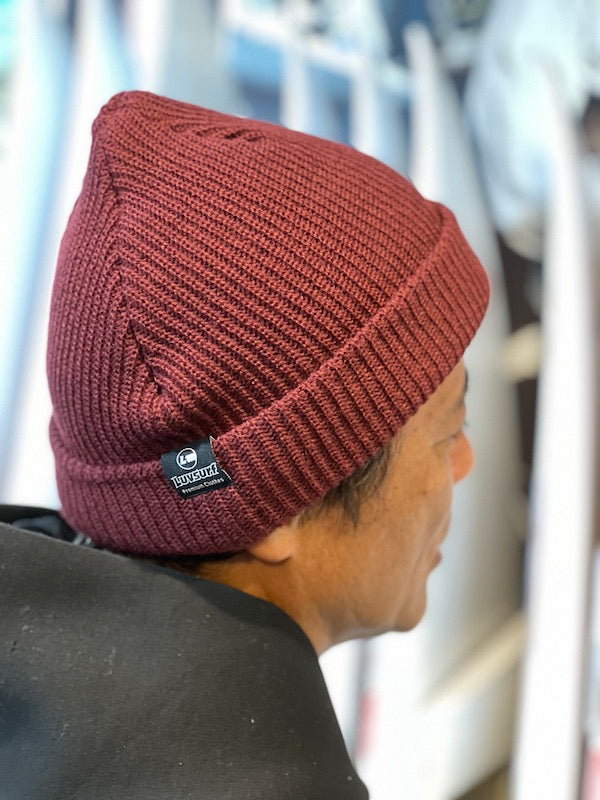 This is a simple and timeless knit hat featuring the Luvsurf brand name.