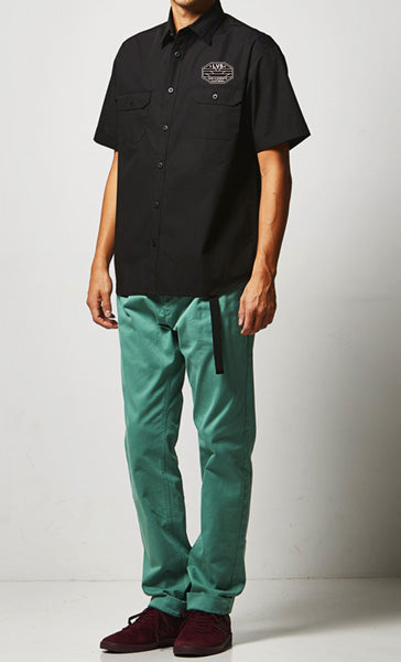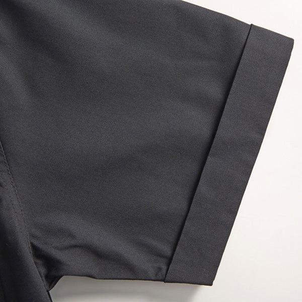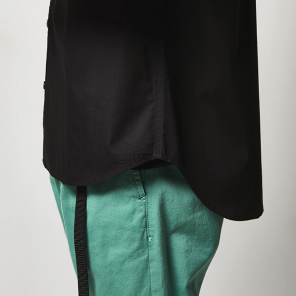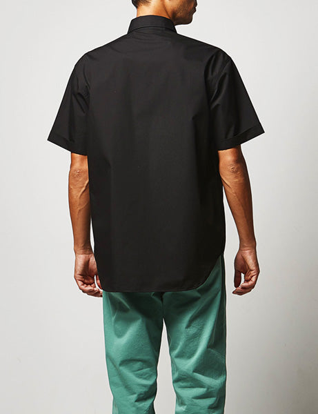 The key features are simple and classic sewing details such as two-needle chain stitching and a flap pocket with a pen holder.
