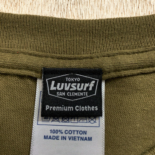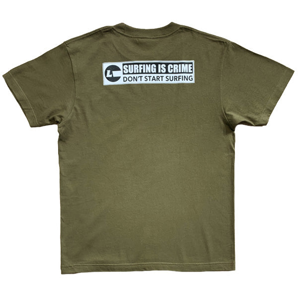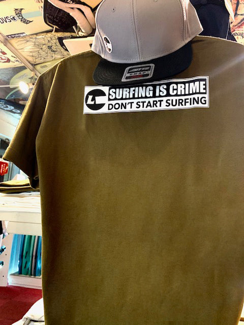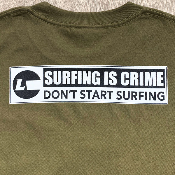 It features Luvsurf's popular I-CON print on the chest and a "SURFING IS CRIME" message print on the back.