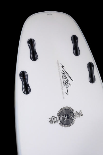 DOUBLE DARTサーフボードは本体の色が黒い為に、バキュームグラス手法ならではのカーボン繊維のラインが傷のように見えたり、通常のサーフボードと同じように製造過程でできる傷や、フィンガープリントがより見えている場合がございます。それらはDOUBLE DARTサーフボードのパフォーマンス性能やご使用には問題ありませんのでご安心してお求めください。
