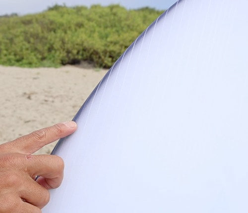 DOUBLE DARTサーフボードは本体の色が黒い為に、バキュームグラス手法ならではのカーボン繊維のラインが傷のように見えたり、通常のサーフボードと同じように製造過程でできる傷や、フィンガープリントがより見えている場合がございます。それらはDOUBLE DARTサーフボードのパフォーマンス性能やご使用には問題ありませんのでご安心してお求めください。