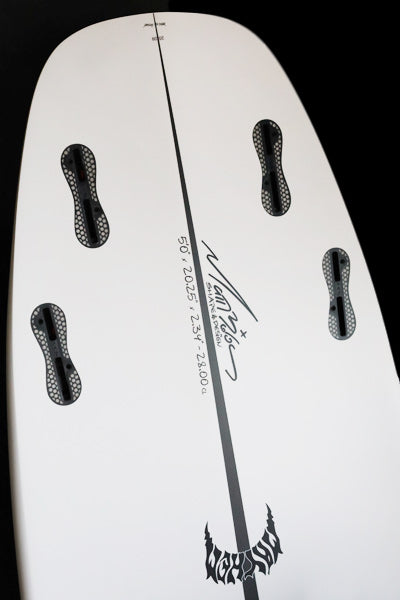 控えめなロッカーカーブとボトムにはコンケーブとVeeを混合、丸々したレールやワイドなアウトラインの関係性でリフトを生み出すので、 アメンボのように簡単に水の上を歩くように滑り動き回れます。