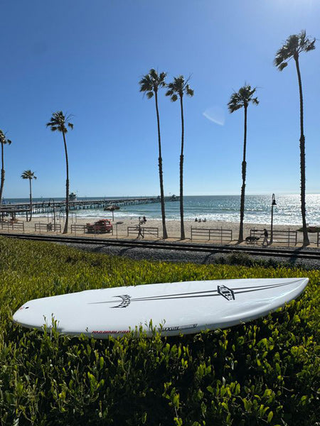 控えめなセミビークノーズ形状はノーズ先端までボードのボリュームを持たせることができ前に荷重するパドルができるので必然的にパドルが早く進み早いテイクオフが可能なように設計しました。
