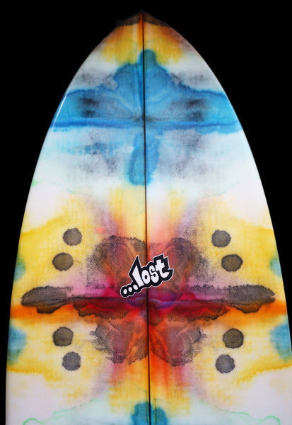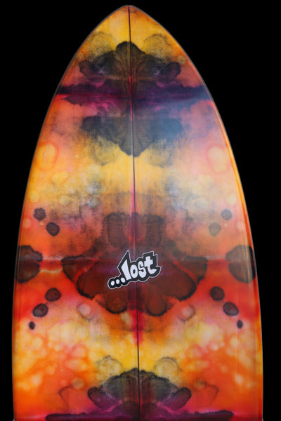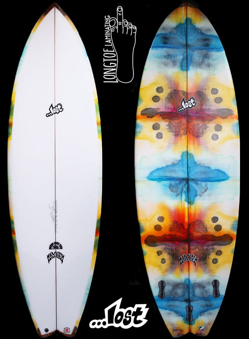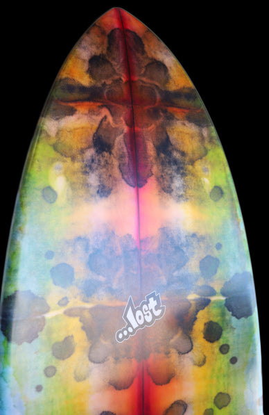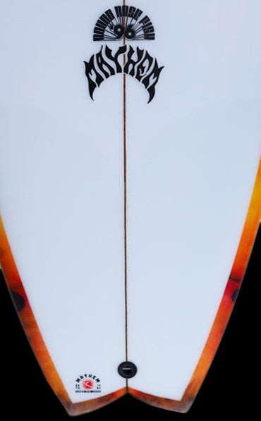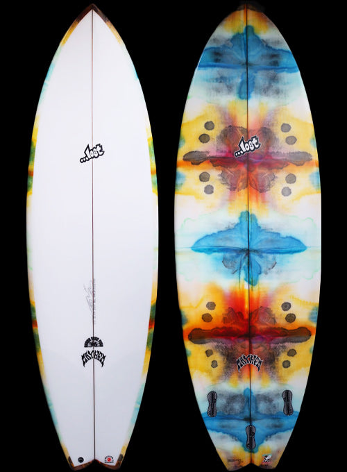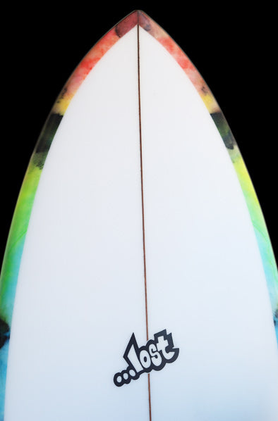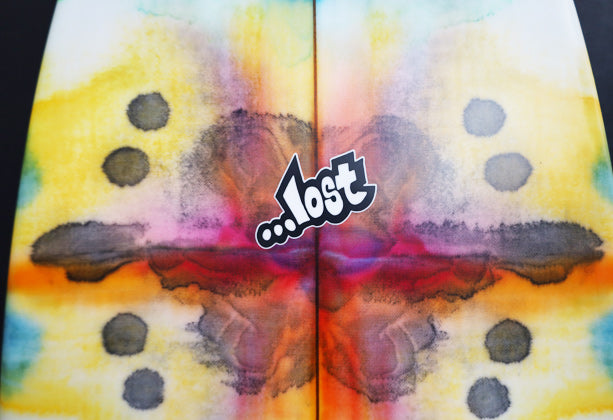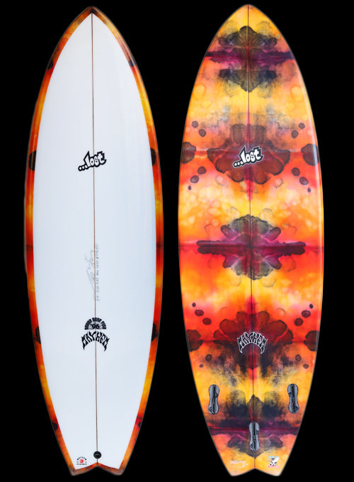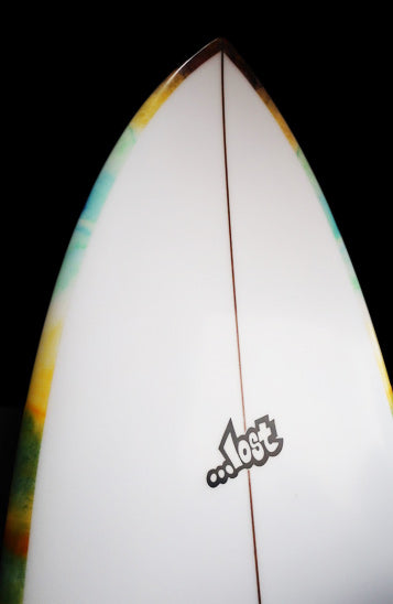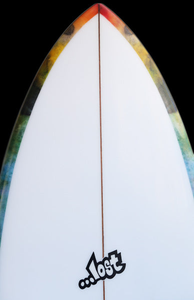 約25年前に、LOSTサーフボードのシェイプデザイナー『マットMAYHEMバイオロス』が世界的にサーフボードデザイナーとして認められるきっかけになったボードが、今回リリースされた『RNF’96』モデルのベース『Rounf Nose Fish』モデルです。1996年当時の世界中のショートボーダーは、6’1”前後の長さで、幅が細く、厚さは薄く、ポテトチップスのようにロッカーがキツくて、尖ったポイントノーズ細いスカッシュテールのボードが主流で乗っていました。そんな細くて薄いボードに乗っていた世界中のサーファーを驚かせたのが、LOST『Rounf Nose Fish』モデルの登場でした。当時、ワールトツアー入りする前で、若手だった「クリスワード」「コーリーロペス」故「アンディアイアン」達が、LOSTから発売された「5’5” X 19 1/4”」というタイトルのVHSムービーでこの『Rounf Nose Fish』に乗り、ワイメアのショアブレイクやロッキーなどハワイのリーフブレイクからビーチブレイクまでを斬新なマニューバーで波を切り刻む革命的なサーフィンをしたのです。25年ほど前に「5’5” X 19 1/4”」というタイトルのLOSTムービーをVHSやDVDで夢中になってご覧になったサーフィン歴の長いベテランの方も大勢いると思います。誰も見たことの無い、丸いノーズで短いボードなのに、大きなバレルから小さな波まで乗りこなせるLOST『Rounf Nose Fish』は、それまであった幅広いテールで重たくてゆったりと遅い動きしかできないのがFISHボードと思われていた印象を覆したのです。