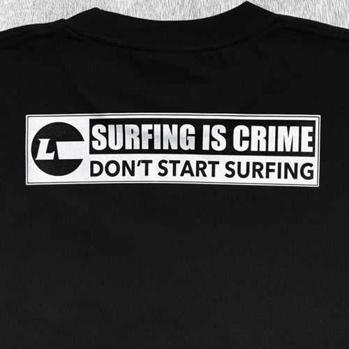 胸にはLuvsurf の人気I-CONプリント、背中には「SURFING IS CRIME」のメッセージプリント入り。