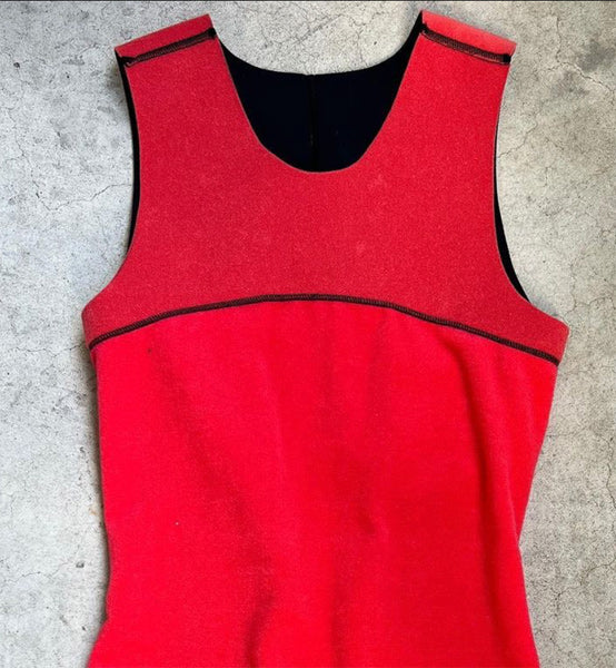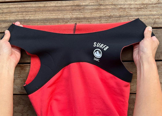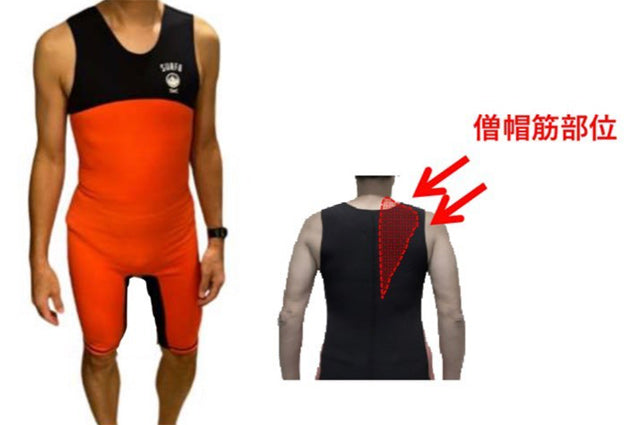 僧帽筋を温めるため胸・肩・背中面に超伸縮 1mm厚ネオプレンストレッチジャージを使用し一層の保温性を高めています。お腹を含めた全身は運動性を重視して通常のマグマコア起毛ジャージを使用し上半身の動きを妨げないよう生地をアレンジしています。