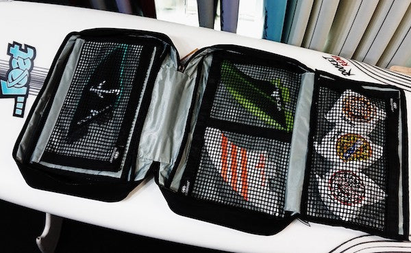 フィン以外に必要なワックスやコーム、リペアグッズなどのサーフグッズはもうひとつの、内側のポケットへ。