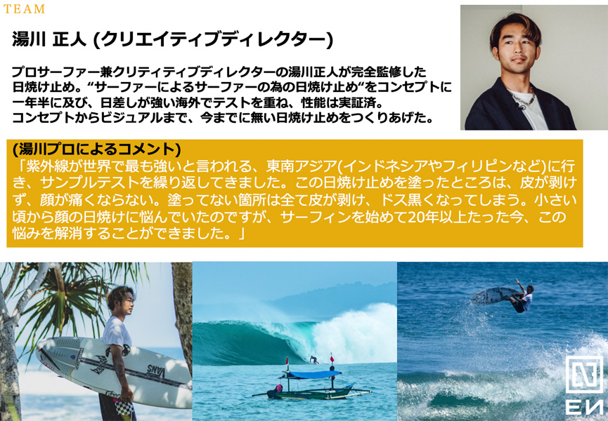 プロサーファー兼クリティティブディレクターの湯川正人が完全監修した 日焼け止め。“サーファーによるサーファーの為の日焼け止め“をコンセプトに 一年半に及び、日差しが強い海外でテストを重ね、性能は実証済。 コンセプトからビジュアルまで、今までに無い日焼け止めをつくりあげた。