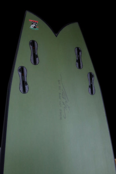 DOUBLE DARTサーフボードは本体の色が黒い為に、バキュームグラス手法ならではのカーボン繊維のラインが傷のように見えたり、通常のサーフボードと同じように製造過程でできる傷や、フィンガープリントがより見えている場合がございます。それらはDOUBLE DARTサーフボードのパフォーマンス性能やご使用には問題ありませんのでご安心してお求めください。