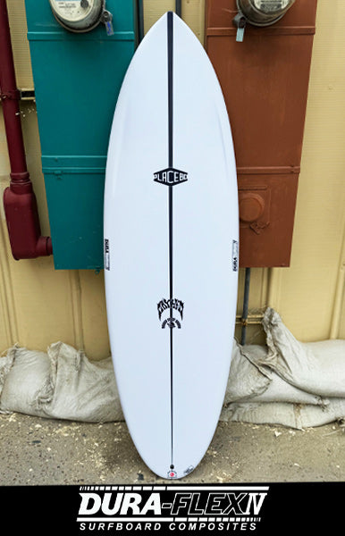 PLACEBOのエコフレンドリーなNEWテクノロジーとして発売になったのがこの『DURA-FLEX』デュラフレックスです。PLACEBOブランドらしい長期間乗れる強度と変色しない仕上げを支える新コンポジットサーフボードのコアになっているのはAERO BLANKというEPSフォームです。そのAERO-BLANK EPSフォームをカスタムシェイプした後、デッキ面へは4+4+6ozの3層を、ボトム面には4+6ozの2層のクロスをエポキシレジンでハンドグラスしてあります。ボードの両面には、ノーズからテールへ1直線に搭載したハーフインチのカーボンストリンガーをビルトインし、ねじれを軽減させ、木製センターストリンガーのPOLYボードに乗りなれた歴の長いベテランサーファーまでもが満足するように芯のある乗り味を提供しています。