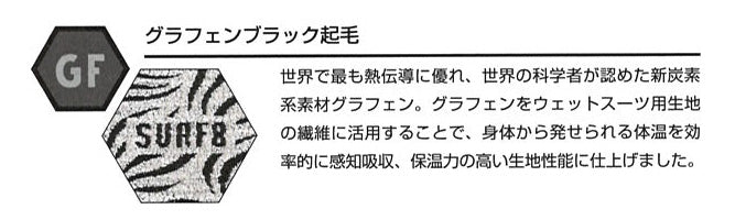 世界で最も熱伝導に優れ、世界の科学者が認めた新炭素系素材グラフェン。グラフェンをウェットスーツ用生地の繊維に活用することで、身体から発せられる体温を効率的に感知吸収、保温力の高い生地性能に仕上げました。
