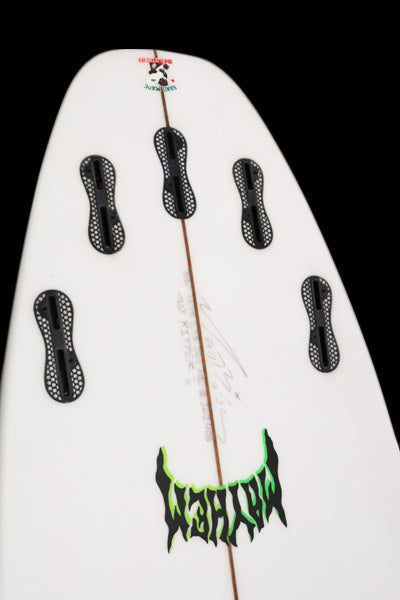 DOUBLE DARTサーフボードは本体の色が黒い為に、バキュームグラス手法ならではのカーボン繊維のラインが傷のように見えたり、通常のサーフボードと同じように製造過程でできる傷や、フィンガープリントがより見えている場合がございます。それらはDOUBLE DARTサーフボードのパフォーマンス性能やご使用には問題ありませんのでご安心してお求めください。