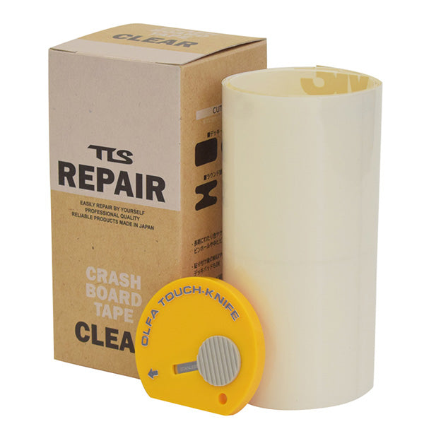 TLS クラッシュテープCクリアは、サーフボードの応急補修用透明テープです。板に貼るだけで海水の浸入を防ぎ、クラッシュ箇所のダメージを最小限に抑えることができます。